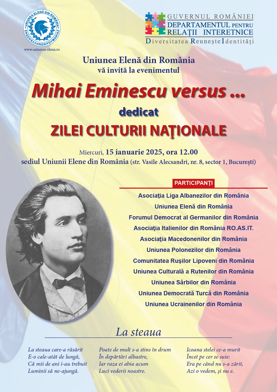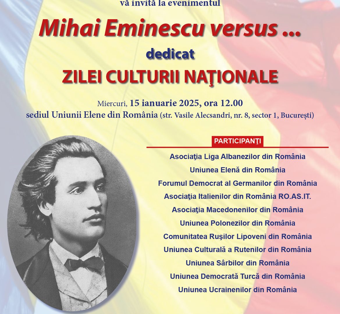 În contextul celebrării naționale, s-a desfășurat evenimentul „Mihai Eminescu – versus…….” organizat de către Departamentul pentru Relații Interetnice al Guvernului României împreună cu Uniunea Elenă din România.