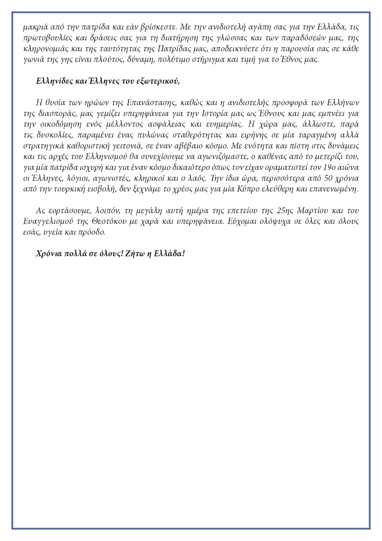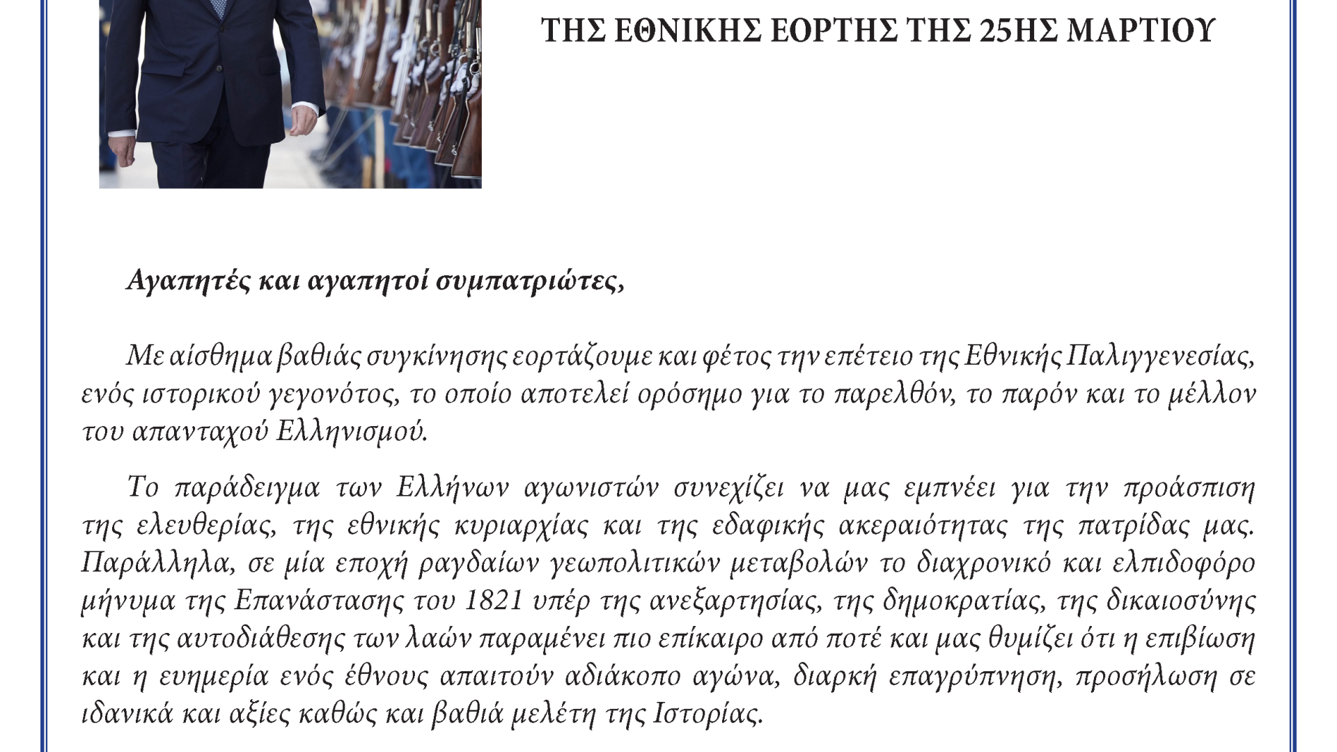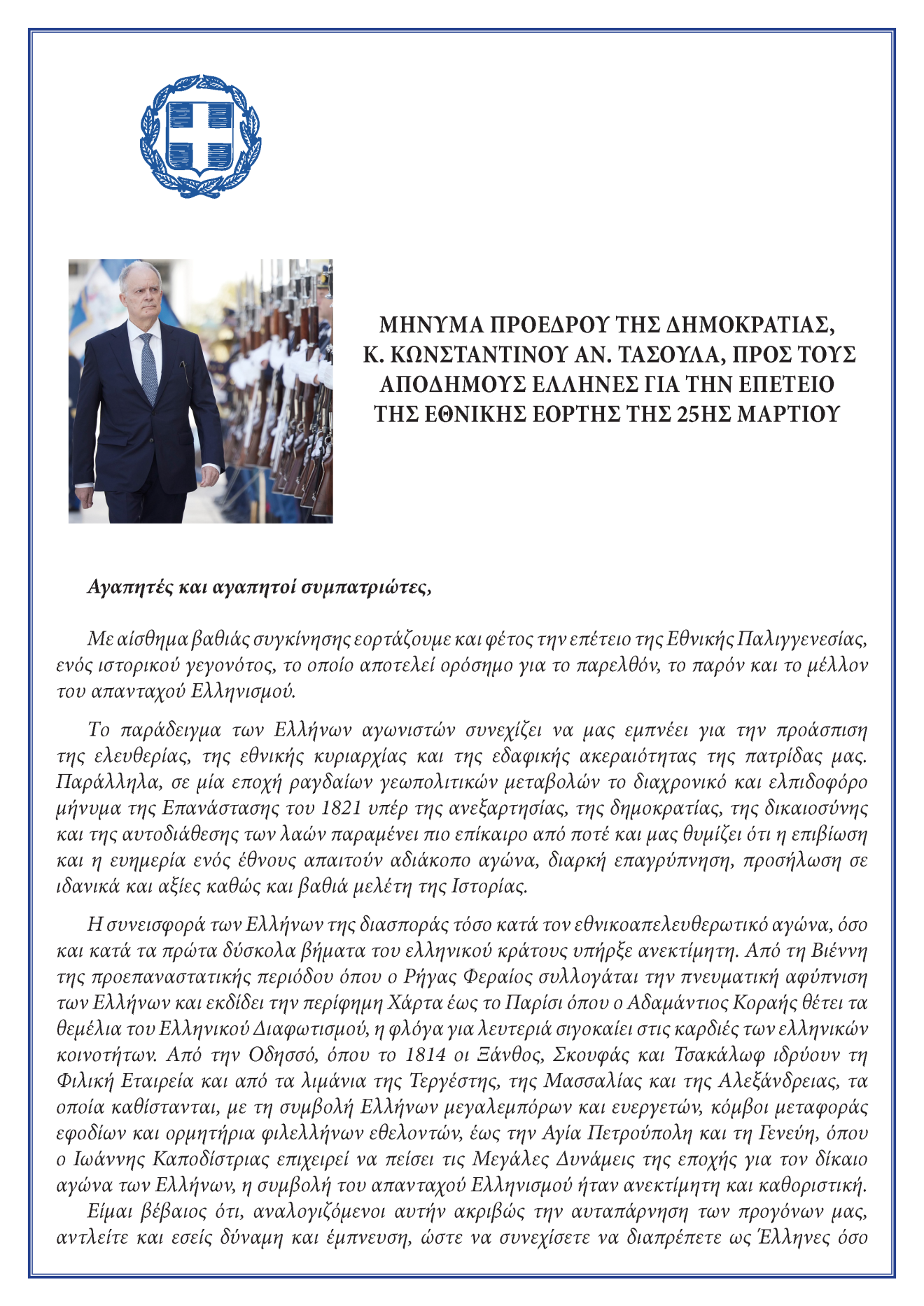 Μήνυμα Προέδρου της Δημοκρατίας, κ. Κωνσταντίνου Αν. Τασούλα, προς τους Απόδημους Έλληνες για την Επέτειο της Εθνικής Εορτής της 25ης Μαρτίου.