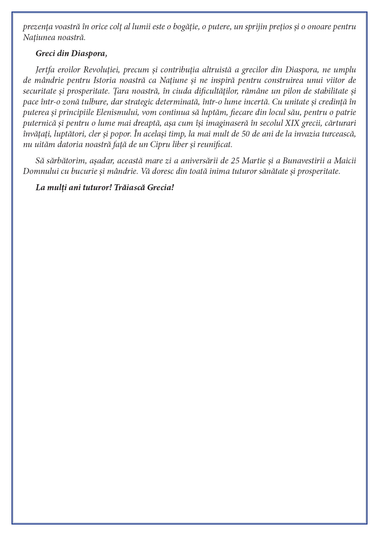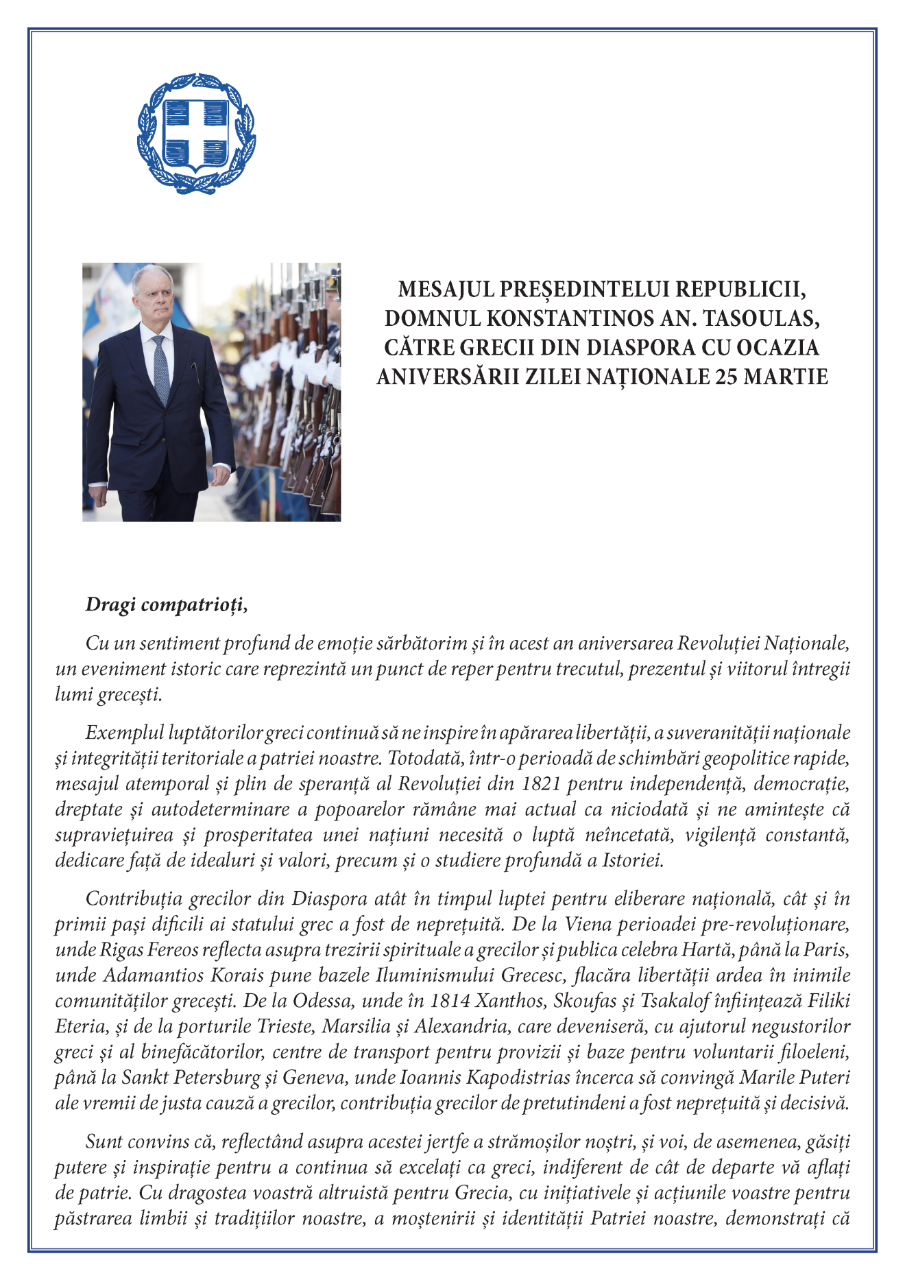 către grecii din Diaspora cu ocazia aniversării Zilei Naționale 25 Martie 2025.