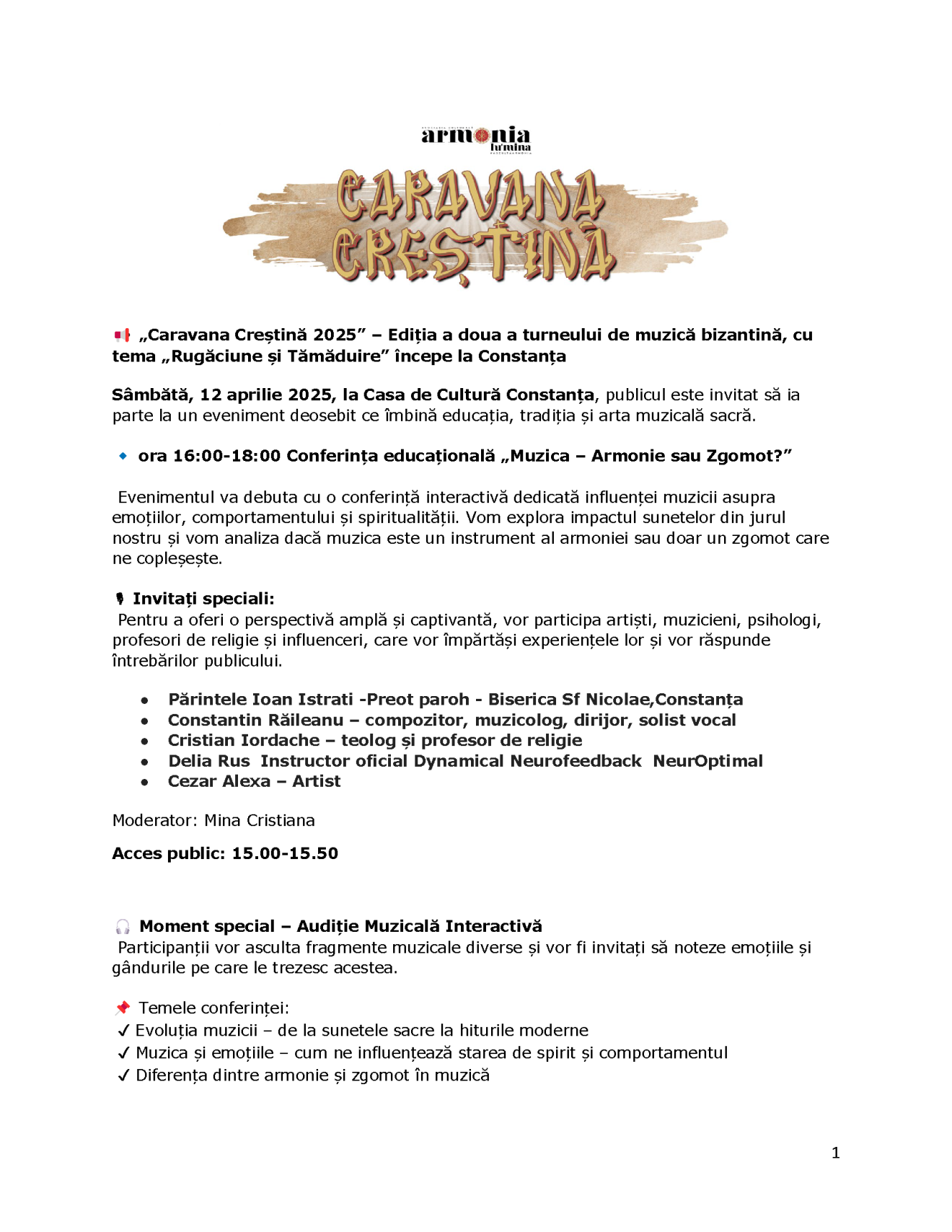 Evenimentul cultural „Muzica – Armonie sau Zgomot?” & Concertul caritabil „Rugăciune și Tămăduire”, parte din turneul național „Caravana Creștină 2025″