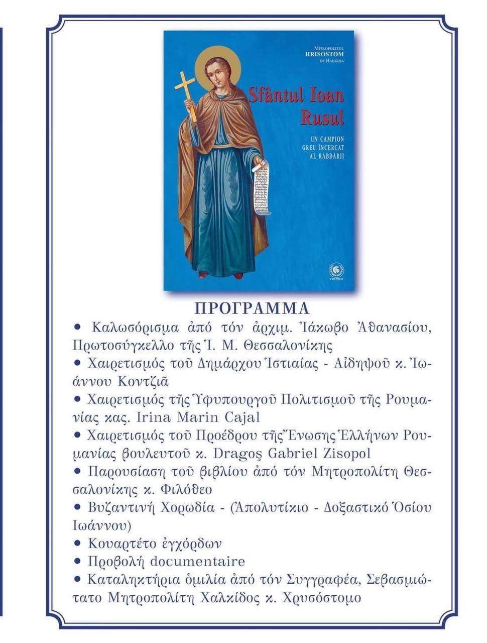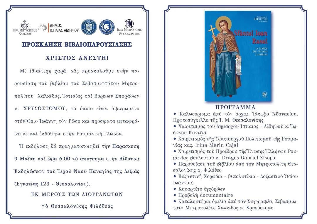 În cadrul celei de-a XXI-a ediții a TÂRGULUI INTERNAȚIONAL DE CARTE DE LA SALONIC vineri, 09 mai 2025, la Centrul Cultural Spiritual al Sfintei Biserici „Panagias Dexias” din Salonic a avut loc lansarea volumului „Sfântul Ioan Rusul. Un campion greu încercat al răbdării”, autor Preasfințitul Hrisostom, Mitropolit de Chalkida, Istiea și Sporadele de Nord, traducere în limba română, Editura UER Press, București, 2025.