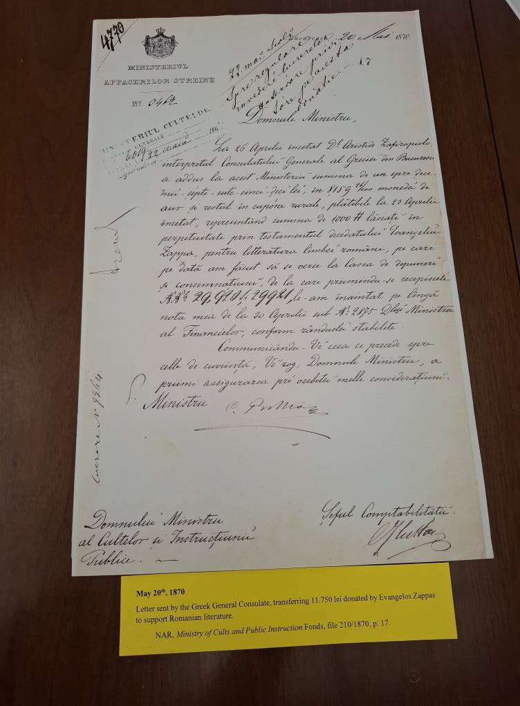 La inițiativa Uniunii Elene din România și cu sprijinul acesteia, Arhivele Naţionale ale României a organizat o expoziție de documente (fotocopii) având ca temă activitatea și moștenirea lui Evanghelia Zappa pe pământ românesc.