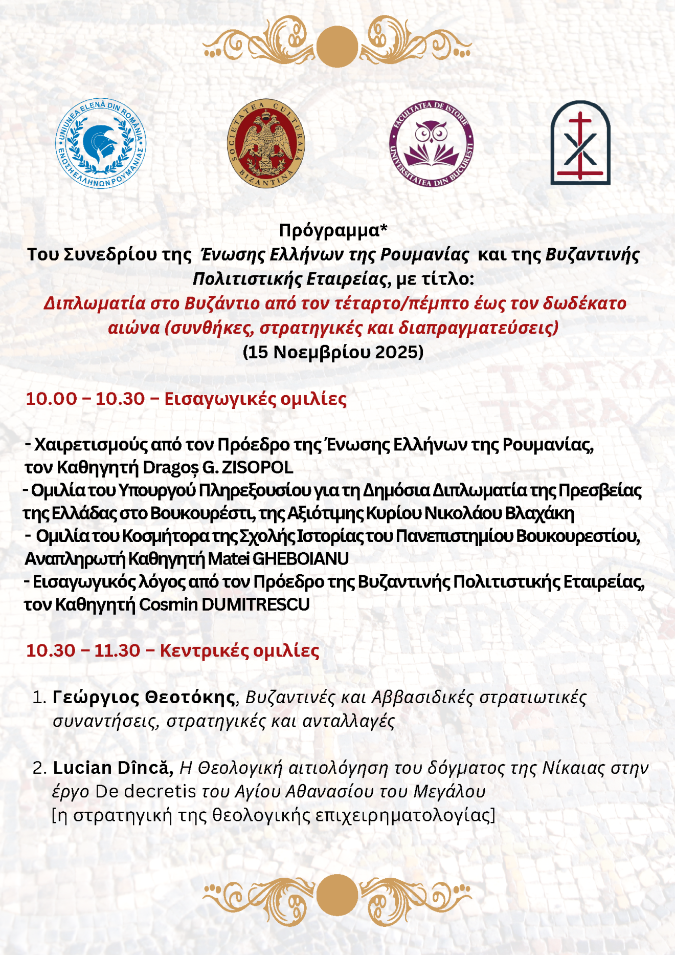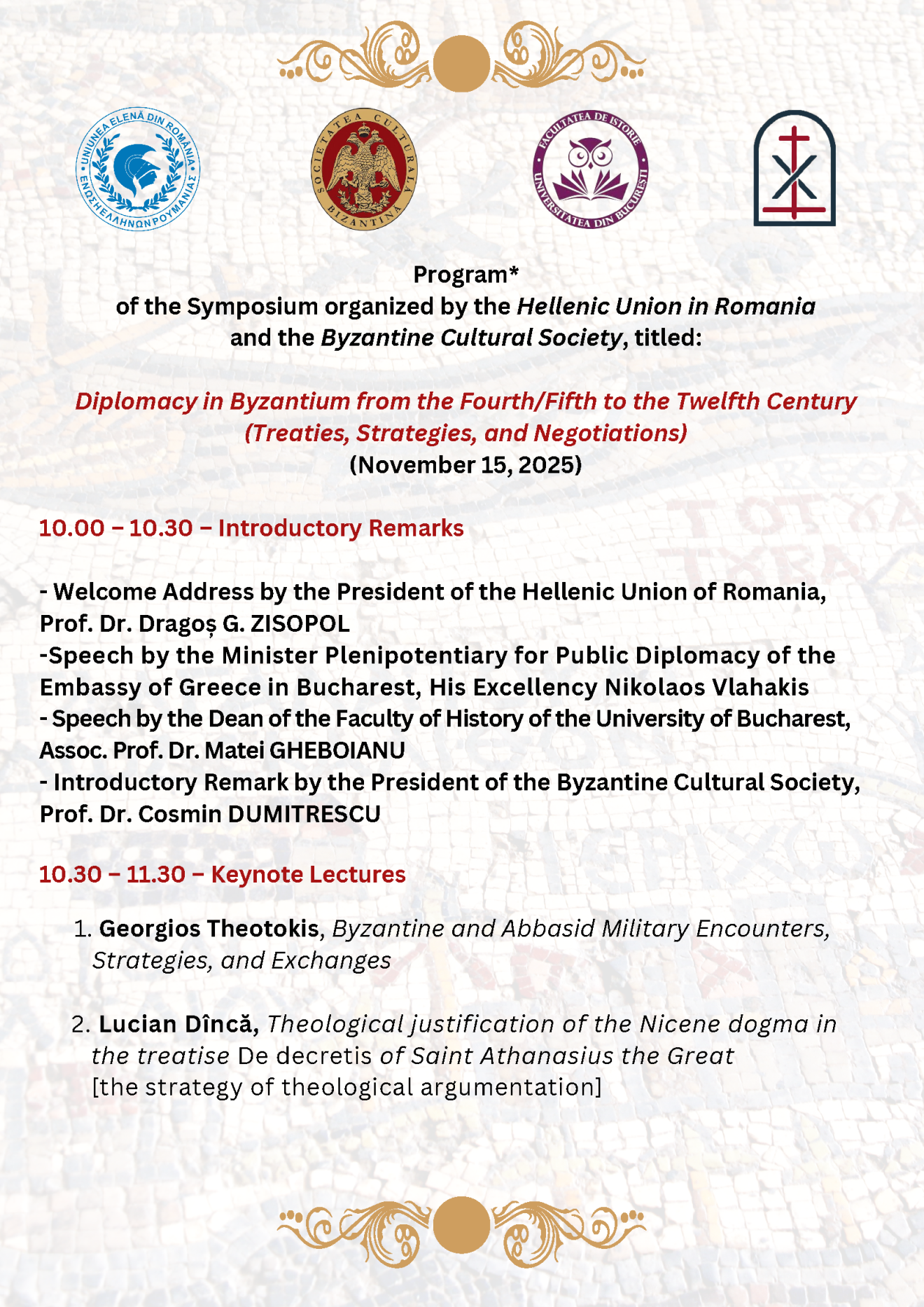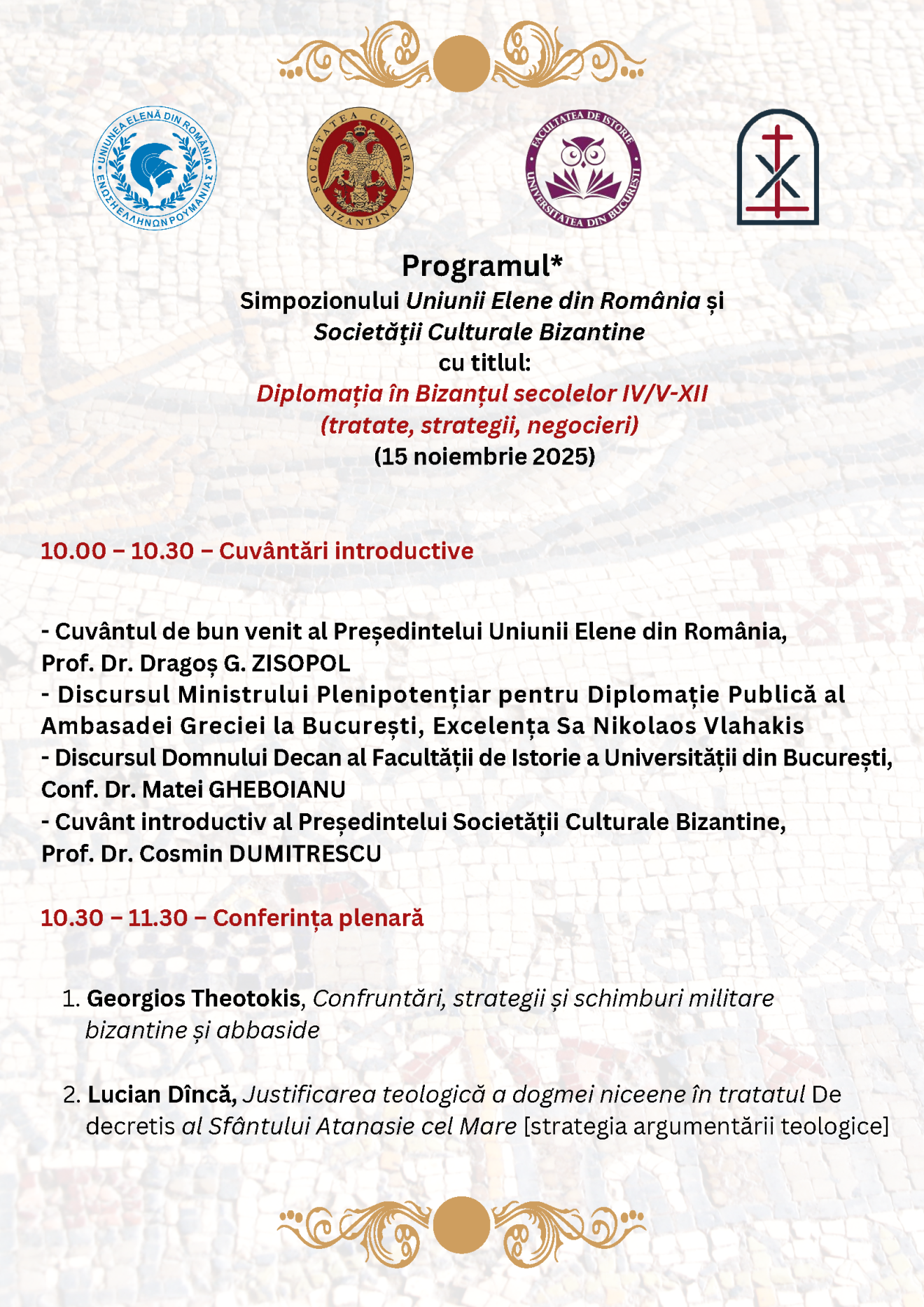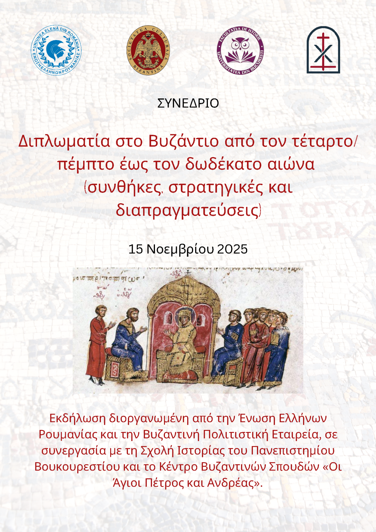 Sâmbătă, 15 noiembrie 2025, la sediul Uniunii Elene din România, a avut loc a XII-a ediție a Simpozion-ului „Studii Bizantine”, un proiect organizat de Uniunea Elenă din România și Societatea Culturală Bizantină, în parteneriat Facultatea de Istorie a Universității București și Centrul de Studii Bizantine „Sfinții Petru și Andrei”