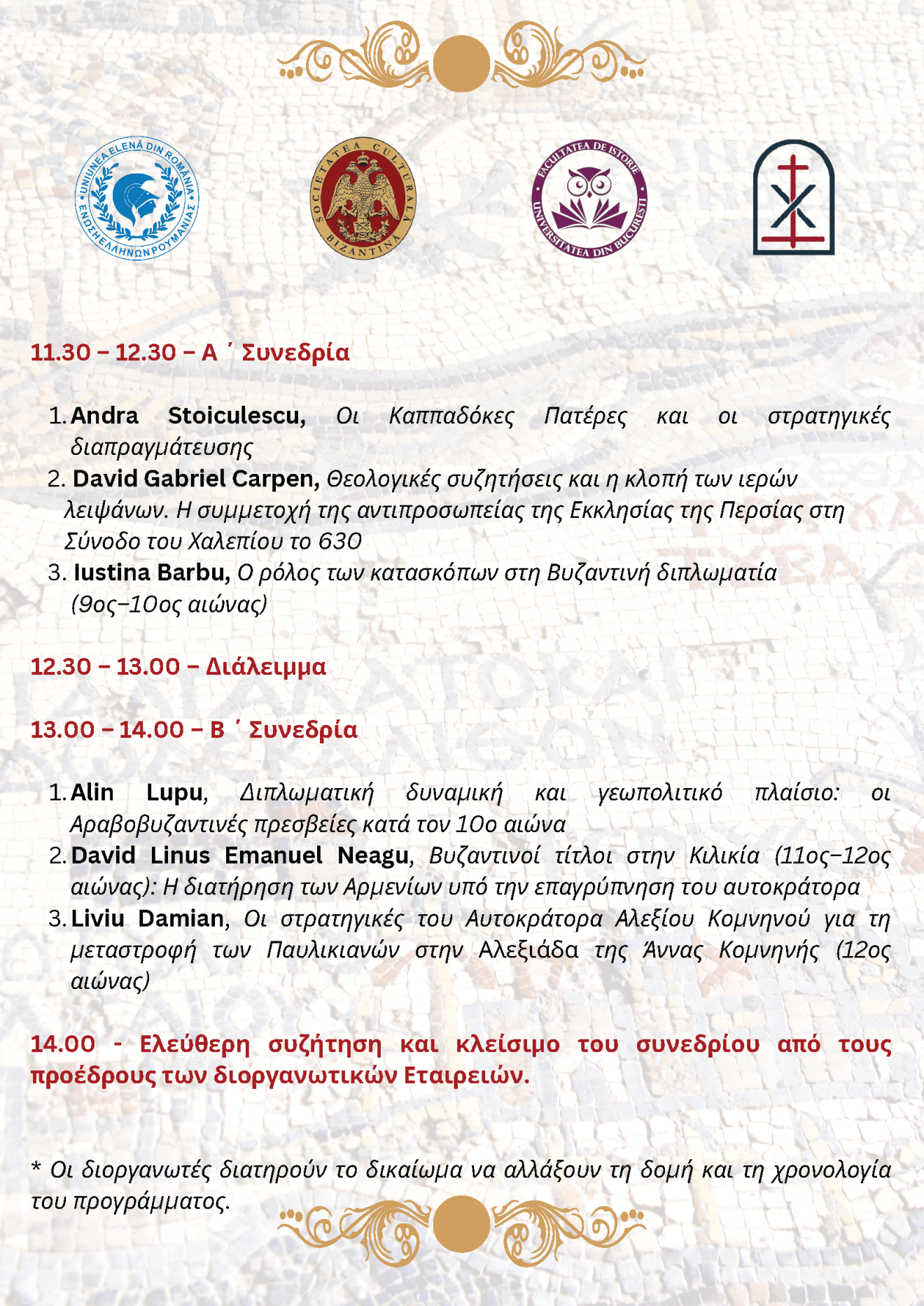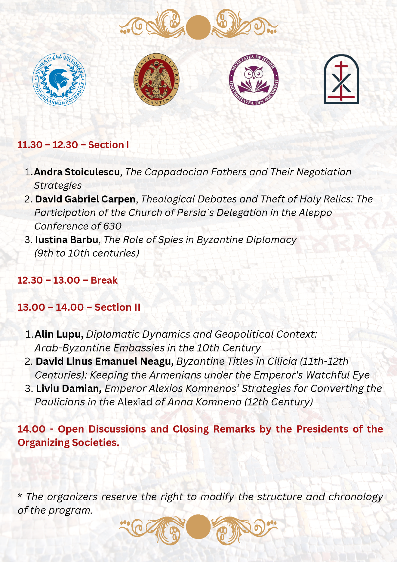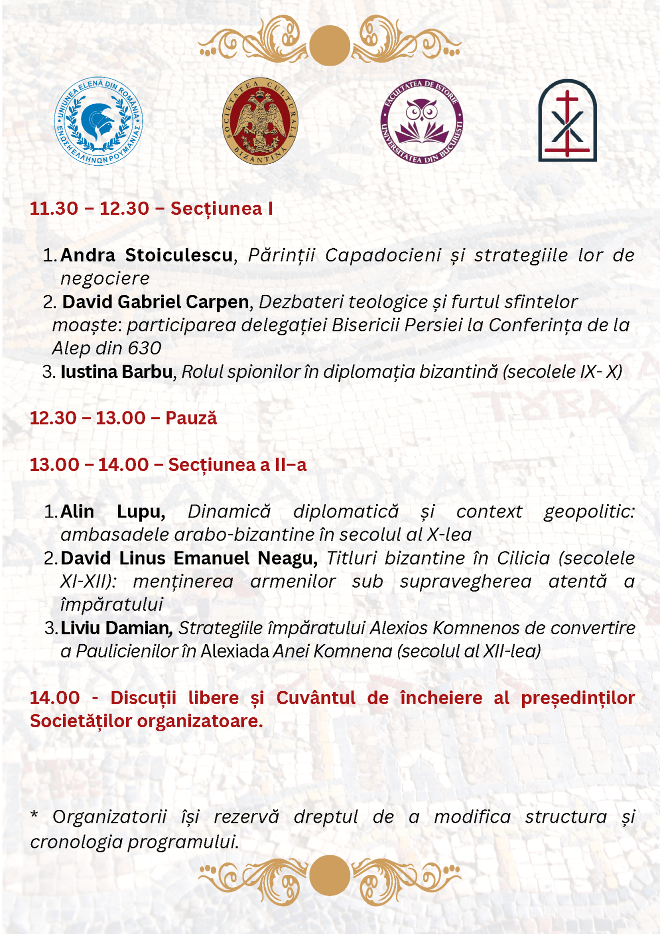 Sub titlul simpozionului din acest an „Diplomația în Bizanțul secolelor IV/V-XII (tratate, strategii, negocieri)” au susținut comunicări dr. Georgios Theotokis, preot prof. univ. Lucian Dîncă, domnul lector univ. dr. Liviu Damian, doamna asist. univ. dr. Andra Stoiculescu, dr. Iustina Barbu, domnul dr. David Neagu, cercetător științific, domnul dr. Alin Lupu, dr. David Gabriel Carpen.