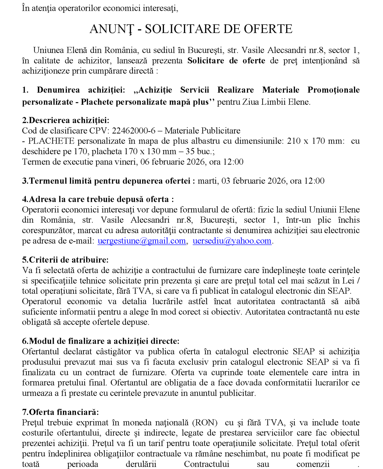 • ,,Achiziţie servicii de traducere carte din domeniul religios/istoric cu titlul ,,Slava Sfintei noastre Parascheva de la Epivate. Din Localitatea Traciei de Orient până la Hiperlocalitatea Balcanilor’’ din limba greacă ȋn limba română’’ (Cod CPV – 79530000-8)