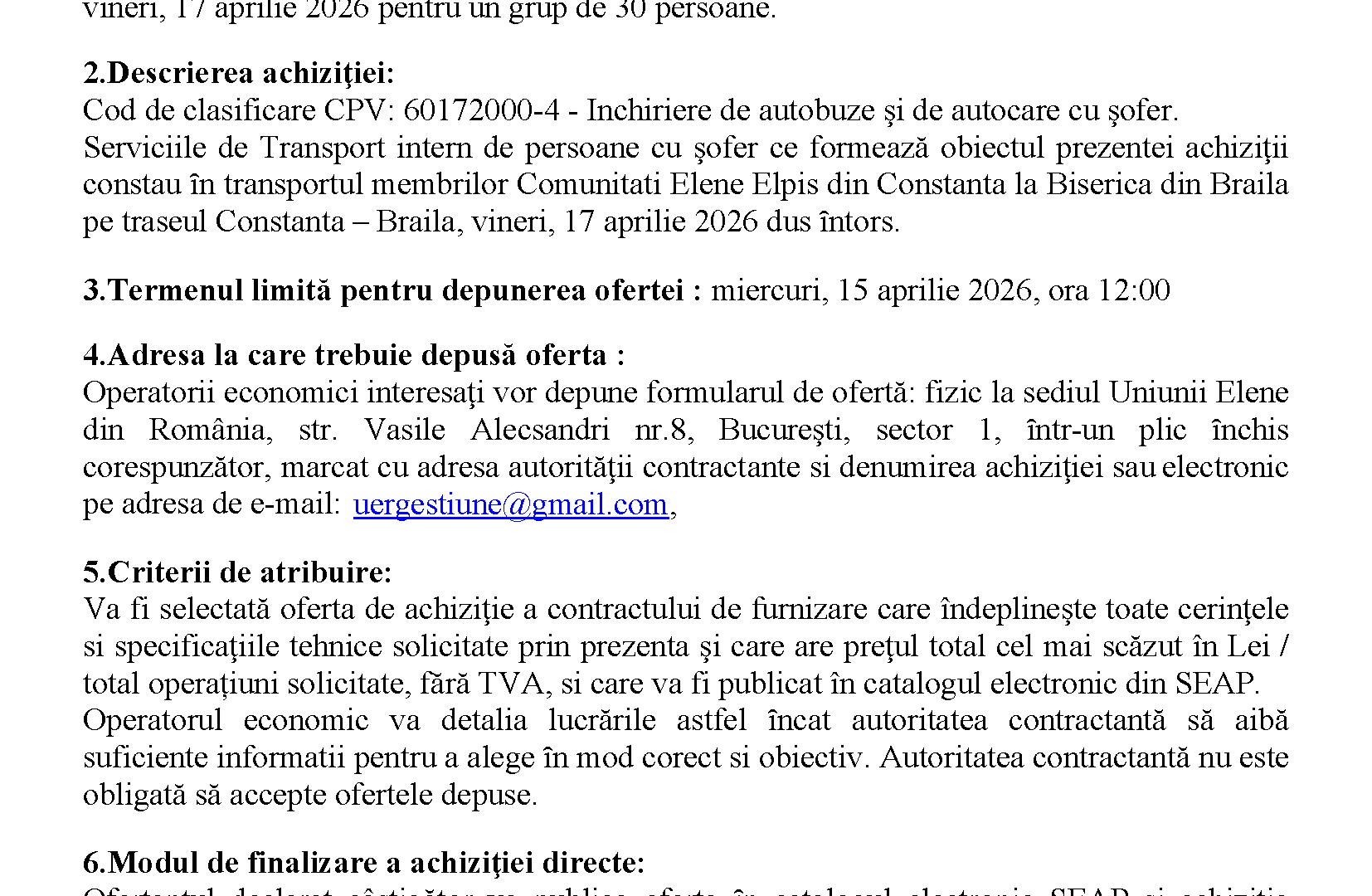 Achiziţie servicii de închiriere autocar cu șofer pentru transport intern de persoane Constanța – Brăila Categorized in: Achizitii Posted on: aprilie 14, 2026 Last updated on: aprilie 14, 2026 Written by: Uer Press Skip back to main navigation