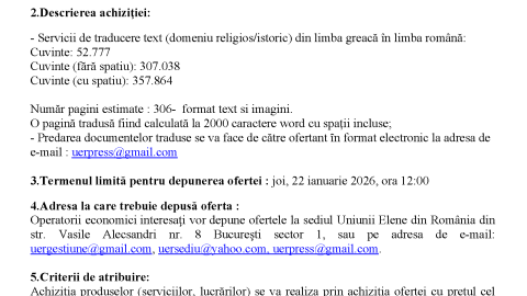 ,,Achiziţie servicii de traducere carte din domeniul religios/istoric cu titlul ,,Slava Sfintei noastre Parascheva de la Epivate. Din Localitatea Traciei de Orient până la Hiperlocalitatea Balcanilor’’ din limba greacă ȋn limba română’’ (Cod CPV – 79530000-8)