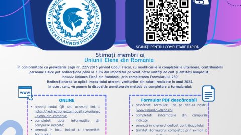 Prin completarea formularui 230 pentru anul 2025 susțineți activitățile Uniunii Elene din România. Vă mulțumim că sunteți alături de noi!
